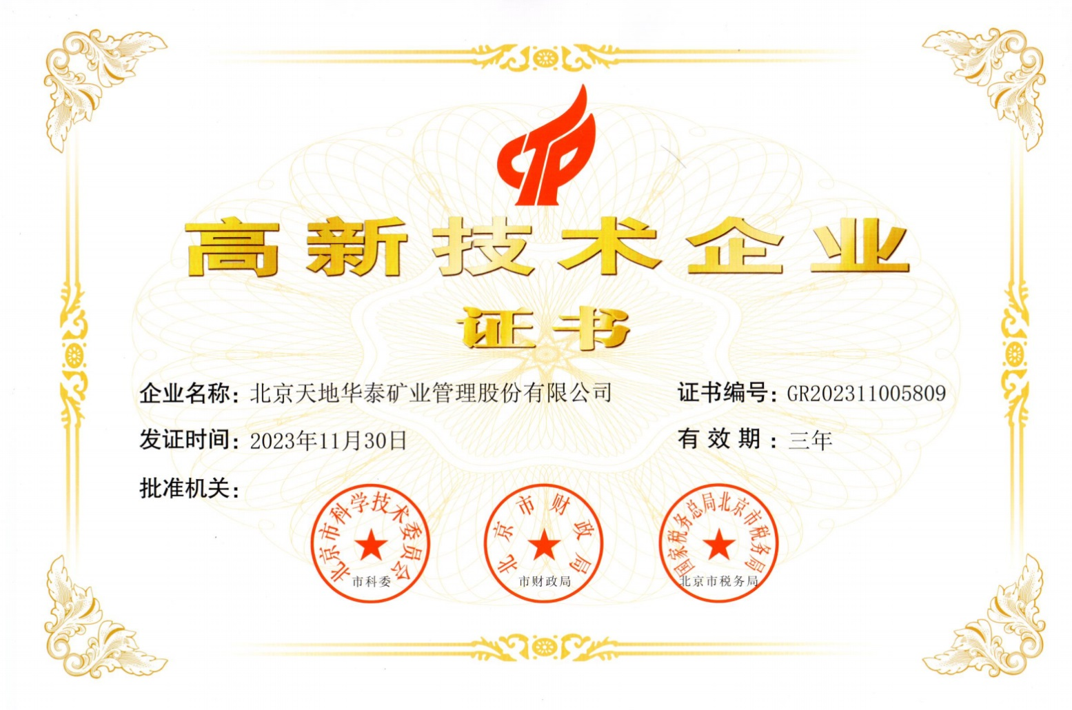 天地华泰顺利通过2023年国家高新技术企业资质认定