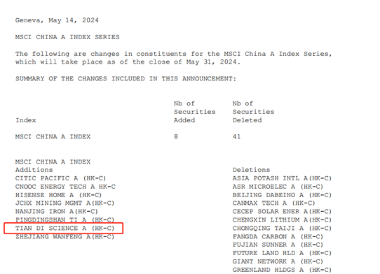 近日,国际指数编制公司MSCI公布了其2024年5月指数调整结果,8只中国A股股票被纳入MSCI中国指数,天地科技(股票代码:600582.SH)位列其中。本次调整结果将于2024年5月31日收盘后生效。