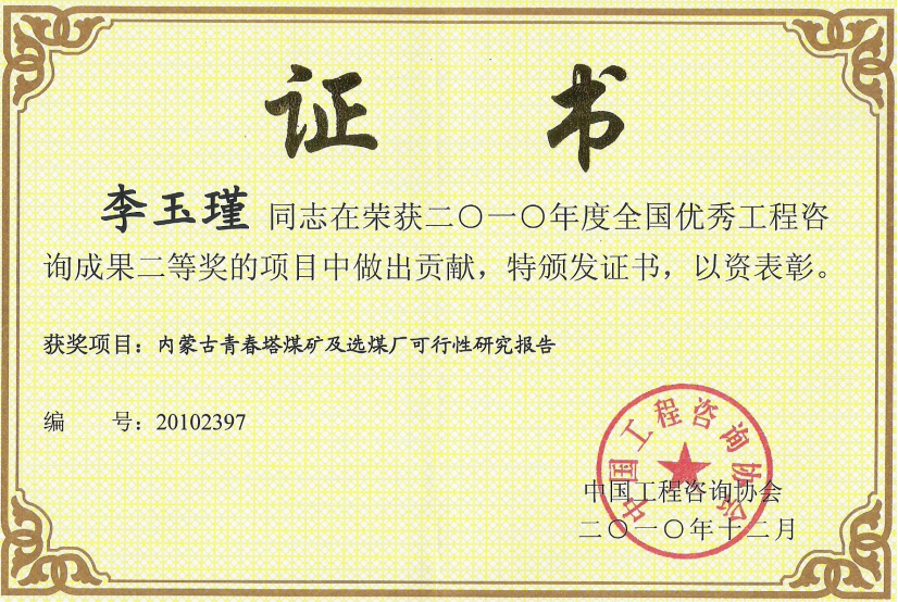 李玉瑾,男,甘肃庆阳人,煤炭行业设计大师,教高,硕士,北京华宇工程有限公司,副总工程师,中国煤炭工业技术委员会委员,中国煤炭建设协会机电专业副主任委员。执笔2016版《煤矿安全规程》、《煤矿安全规程执行说明》修编,出版学术著作2部、参编3部;主编国家规范1部、参编5部。发表论文70篇。获得“《煤炭学报》创刊五十周年百篇最具影响力学术论文奖”、“《煤炭工程》”创刊60周年突出贡献奖”。 获省部级科技进步一等奖1项、二等奖2项,三等奖3项。全国优秀工程咨询一等奖1项、二等奖1项,全国优秀设计奖铜奖1项;煤炭行业优秀工程设计一等奖4项,二等奖2项。煤炭行业优秀工程成果奖一等奖3项,二等奖1项,三等奖1项。