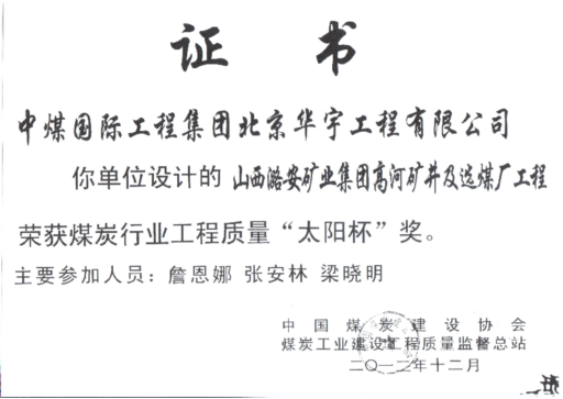 作为项目负责人主持设计的山西潞安集团、亚美大陆煤炭公司中外合作高河矿井设计生产能力6.00Mt/a,2011年6月首采工作面开始联合试运转。是国内当时设计较早的现代化大型井工矿,设计树立高起点,注重结合地质、资源等实际情况,追求系统简单、实用、顺畅,设备搭配合理、可靠,使设计达到了国际同期同领域的先进水平。矿井荣获2012-2013年度中国建设工程鲁班奖及煤炭行业优秀工程设计一等奖。